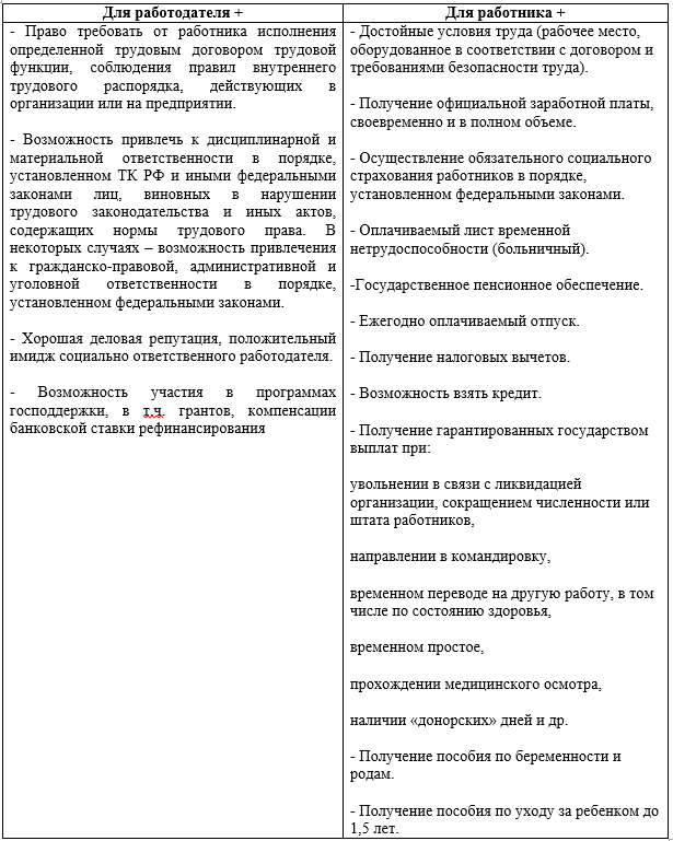 Легализация трудовых отношений предполагает официальное трудоустройство (заключение официальных трудовых договоров) со всеми сотрудниками предприятия. Ежемесячные налоговые отчисления во внебюджетные фонды и в местный бюджет.
