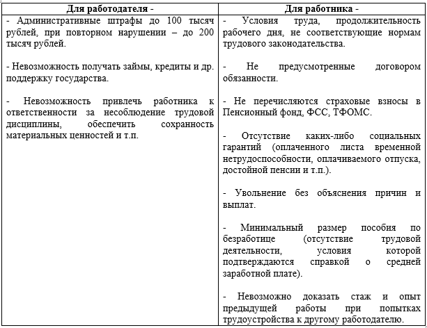 Не оформляя в установленном законодательством порядке прием на работу работника, работодатель лишает его заслуженного пенсионного обеспечения. Период работы без оформления в установленном порядке трудовых отношений не будет включен в страховой стаж, что приведет в будущем к низкому размеру пенсии.