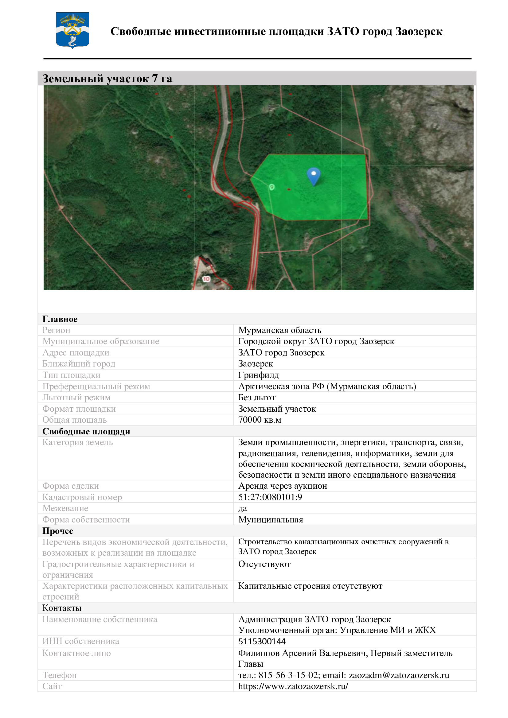 Администрация ЗАТО город Заозерск Структура Администрации ЗАТО город Заозерск Управления Администрации ЗАТО город Заозерск Управление муниципального имущества и жилищно-коммунального хозяйства Администрации ЗАТО город Заозерск ИНВЕСТИЦИОННАЯ ДЕЯТЕЛЬНОСТЬ Инвестиционные площадки ЗАТО город Заозерск
