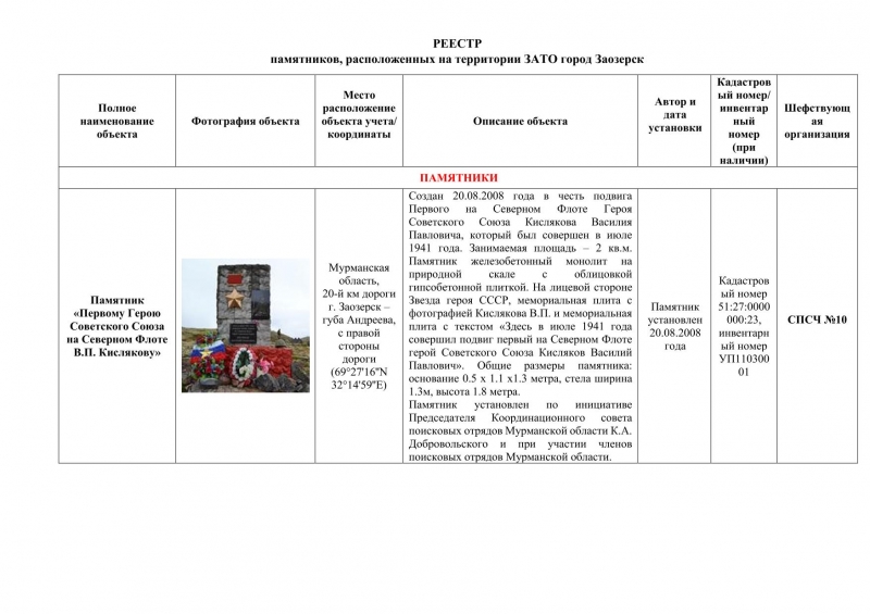 1. Памятник «Первому Герою Советского Союза на Северном Флоте В.П. Кислякову»