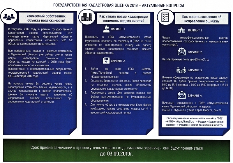 Промежуточные отчетные документы (проект отчета) уже прошли проверку в Управлении Росреестра в части соблюдения требований Методических указаний о государственной кадастровой оценке и размещены в фонде данных государственной кадастровой оценки на сайте Росреестра. Ознакомиться с предварительными результатами кадастровой оценки можно до 03 сентября 2019 года.