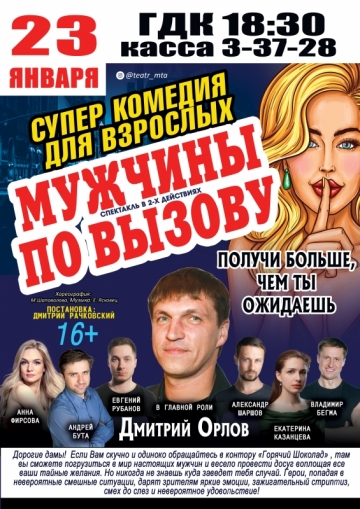 23 января 2020 года в 18.30 ЦКБО приглашает жителей города на спектакль московского театра "Огни Москвы" "Мужчины по вызову" 16+. В главной роли Дмитрий Орлов.