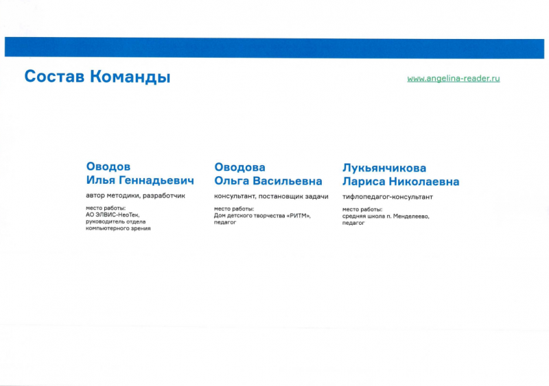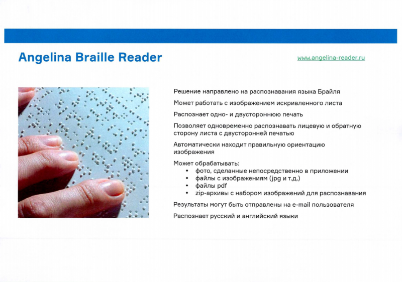 Данное цифровое решение http://angelina-reader.ru находится в свободном доступе и может быть использовано гражданами, профильными сообществами, государственными и иными организациями, предоставляющими людям с нарушением зрения услуги в различных сферах.