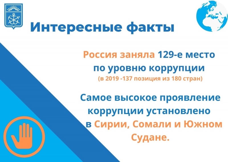 По данным международной организации Transparency International за 2020 год, из 180 стран самое низкое проявление коррупции установлено в Дании, Новой Зеландии и Финляндии. Россия заняла 129-е место (в 2019 году – 137-я позиция из 180 стран). Самое высокое проявление коррупции - 179-ю позицию в рейтинге разделили Сомали и Сирия и Южный Судан.