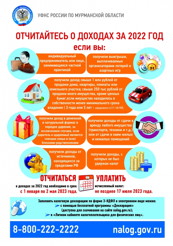 С 01.01.2023 началась декларационная кампания 2023 года, в ходе которой физическим лицам необходимо отчитаться о полученных в 2022 году доходах не позднее 2 мая 2023 года.