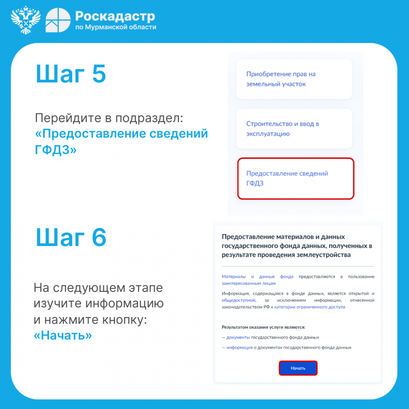 Подать заявление на получение материалов можно с помощью портала «Госуслуги» в разделе «Документы → Недвижимость → Все услуги → Предоставление сведений ГФДЗ → Предоставление материалов и данных государственного фонда данных, полученных в результате проведения землеустройства»;