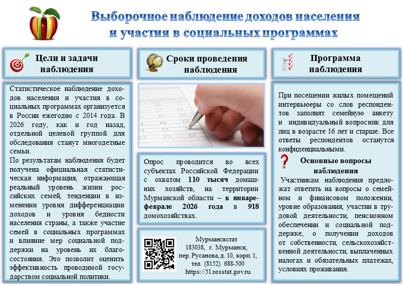 В январе – феврале 2026 года на территории Российской Федерации пройдёт Выборочное наблюдение доходов населения и участия в социальных программах. Обследование проводится ежегодно Федеральной службой государственной статистики. В целом по стране в нём примут участие 110 тысяч домашних хозяйств, в Мурманской области – 918 домохозяйств, в том числе многодетные семьи.