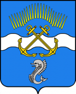 Описание герба: Синее поле щита пересечено по горизонтали белой волнистой линией. На линии – два скрещенных золотых якоря. Под ними изображение морского конька.