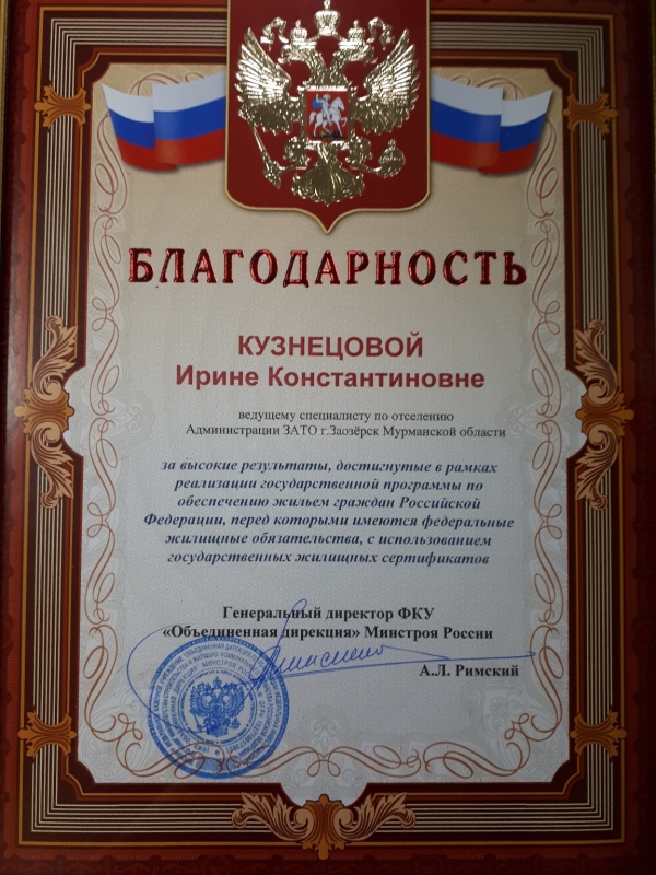 Ведущий специалист по отселению Администрации ЗАТО город Заозерск Кузнецова Ирина Константиновна отмечена Благодарностью генерального директора ФКУ «Объединенная дирекция Минстроя России» - ответственного исполнителя основного мероприятия за высокие результаты, достигнутые в рамках реализации государственной программы по обеспечению жильем категорий граждан, перед которыми имеются федеральные жилищные обязательства с использованием Государственных жилищных сертификатов.