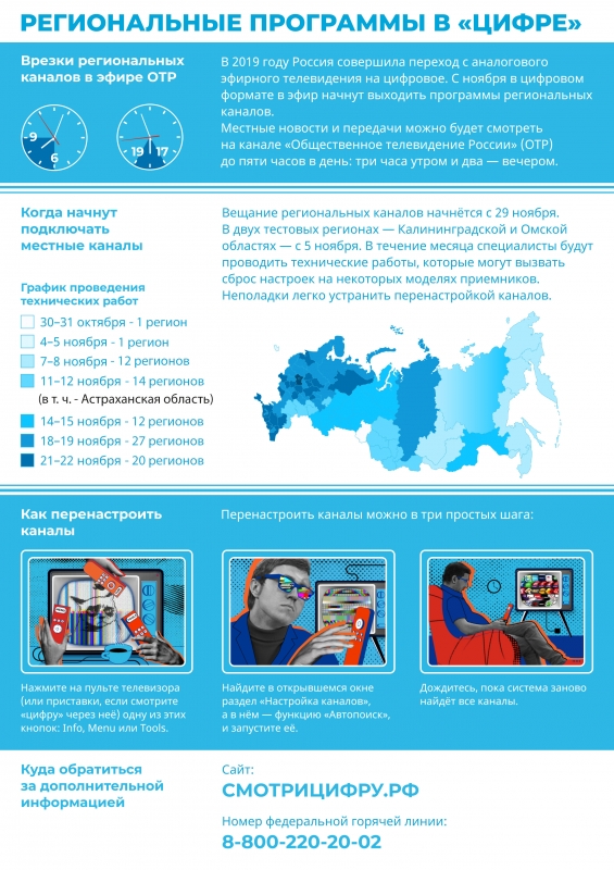 - С 29 ноября 2019 года в рамках первого мультиплекса цифрового эфирного телевидения программам региональных телеканалов будет выделено по 5 часов в день.