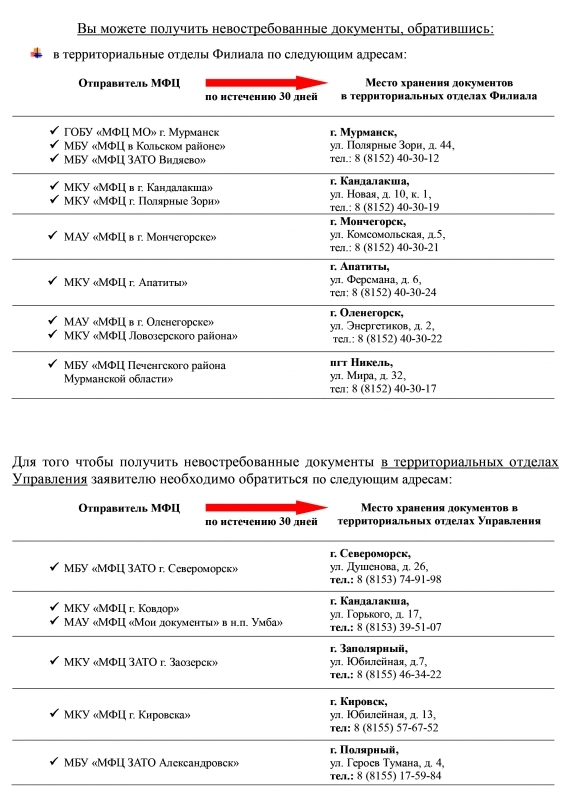 Если в течение 30 дней заявитель не заберет документы из МФЦ по результатам оказания государственных услуг в сфере кадастрового учета и регистрации прав, то их как невостребованные, МФЦ направит в Филиал или в Управление Росреестра по Мурманской области (далее - Управление) для дальнейшего хранения.
