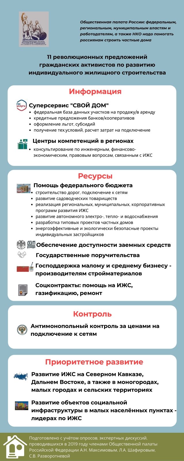 Это далеко не все предложения, рассмотренные Комиссией по территориальному развитию и местному самоуправлению, по ИЖС. О возможности рассмотрения предлагаемых мероприятий и принятию нормативно-правовых актов по организации, развитию, оживлению и регулированию вопросов индивидуального жилищного строительства предлагается Правительству, Министерству строительства и жилищно-коммунального хозяйства, Министерству труда и социального развития, Министерства экономического развития Российской Федерации, Федеральной антимонопольной службе, Центральному Банку Российской Федерации, Акционерному обществу «ДОМ.РФ», высшим должностным лицам, общественным палатам субъектов Российской Федерации, Главам муниципальных образований.