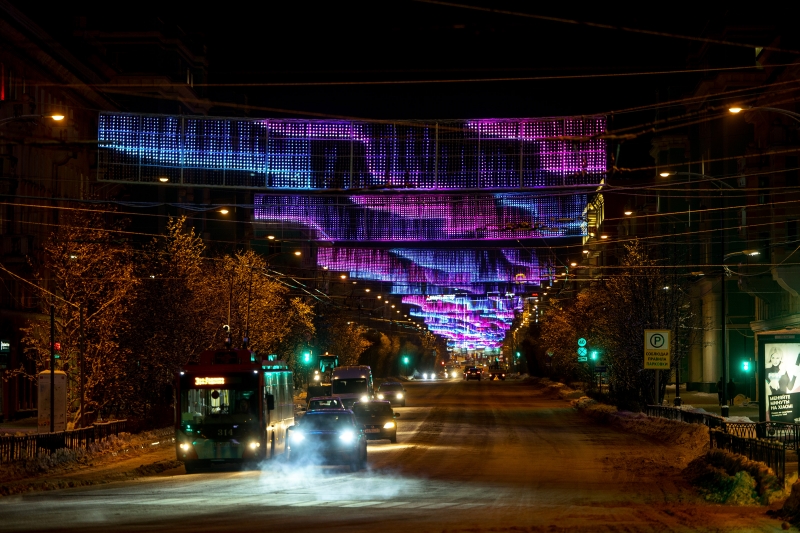 В этом году в Мурманске установлены новые светодиодные динамические перетяжки, выполненные по эксклюзивной технологии, не имеющей аналогов в России. Скажем, в Санкт-Петербурге подобные украшения появятся только в следующем году.