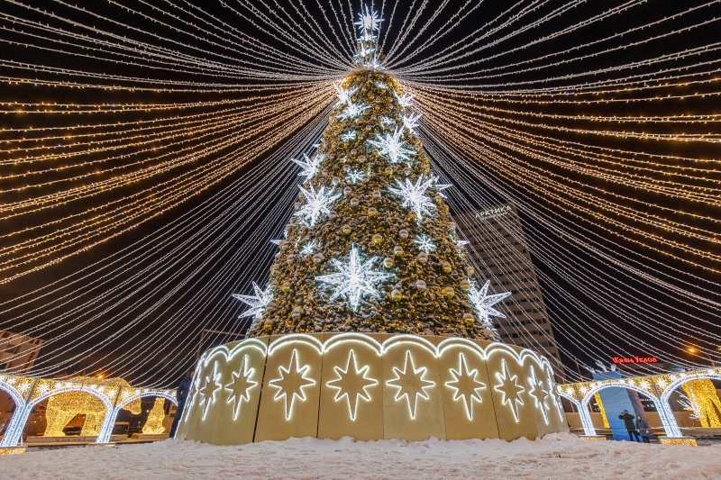 Праздничную атмосферу площади у Театра кукол дополнили световым оформлением деревьев — мягкое свечение тысяч лампочек преображает локацию, дополнительно освещая территорию.