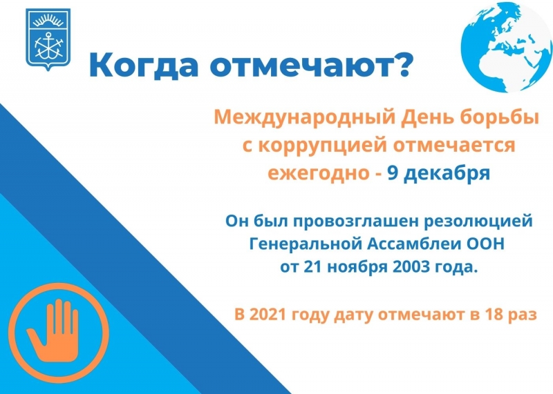 Международный день борьбы с коррупцией отмечается 9 декабря. Он был провозглашен резолюцией Генеральной Ассамблеи ООН от 21 ноября 2003 года № A/RES/58/4. Впервые его отметили в 2004 г.