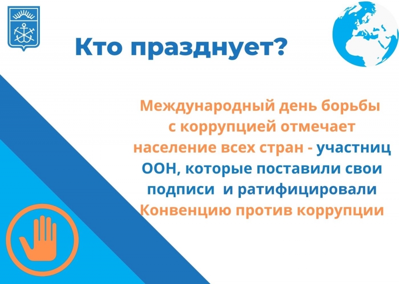 Международный день борьбы с коррупцией отмечает население всех стран-участниц ООН, которые поставили свои подписи и ратифицировали Конвенцию против коррупции. В России в этот день проводятся различные акции и мероприятия.