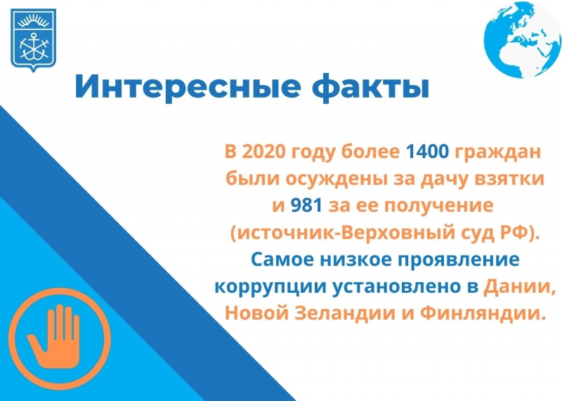 По данным международной организации Transparency International за 2020 год, из 180 стран самое низкое проявление коррупции установлено в Дании, Новой Зеландии и Финляндии. Россия заняла 129-е место (в 2019 году – 137-я позиция из 180 стран). Самое высокое проявление коррупции - 179-ю позицию в рейтинге разделили Сомали и Сирия и Южный Судан.