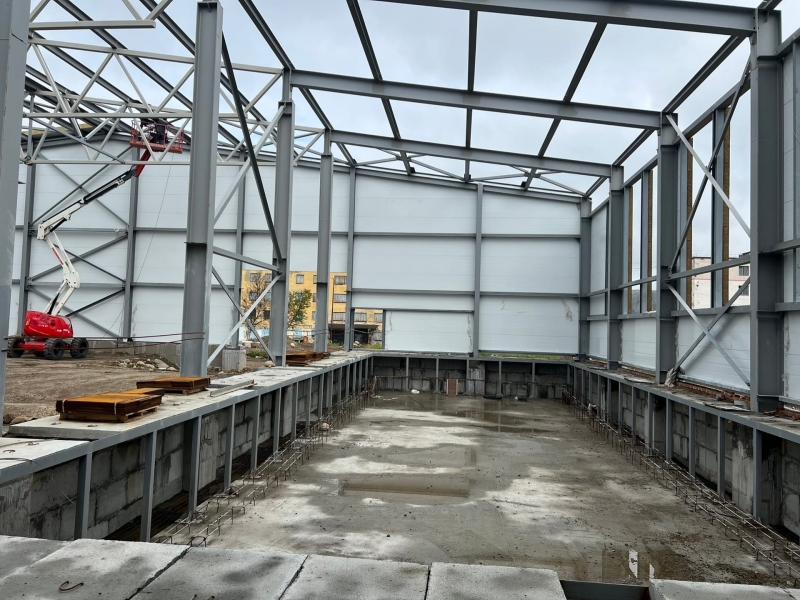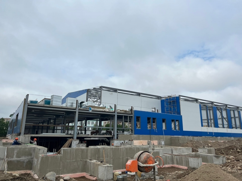 В здании будут расположены малая и большая чаши бассейна, сауна, универсальный игровой зал, раздевалки, душевые, административные помещения. В настоящей момент на объекте проводятся фасадные работы, прокладка коммуникаций и установка кровли. Осенью начнутся работы по внутренней отделке.