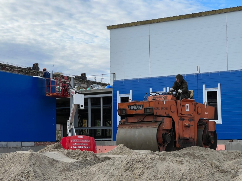 Также активно осуществляется благоустройство территории вокруг комплекса – отсыпка и утрамбовка основания, установка бордюрного камня. До конца сентября участок около здания будет заасфальтирован.