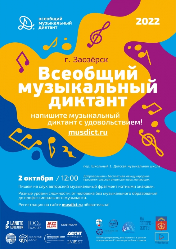 2 октября в 48 регионах России и 4 странах мира в пятый раз состоится Международная просветительская акция «Всеобщий музыкальный диктант», приуроченная к Международному дню музыки и празднованию Столетия российского джаза. Мурманская область традиционно входит в пятерку лидеров по количеству площадок! В Заозёрске акция пройдет на базе Детской музыкальной школы.