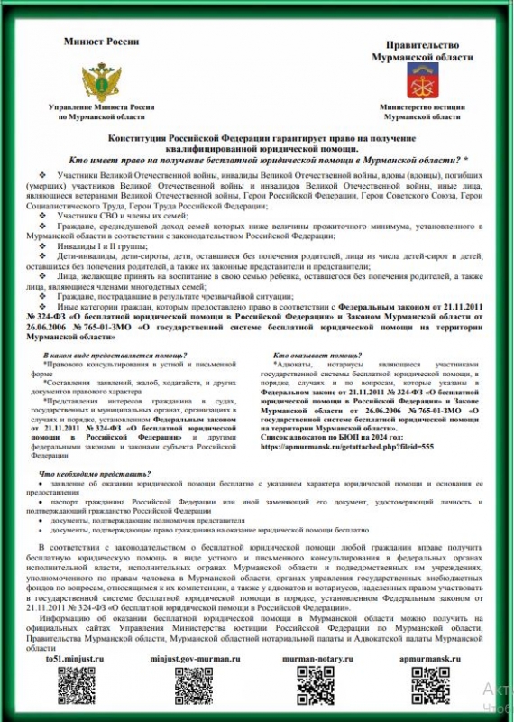 Конституция Российской Федерации гарантирует право на получение квалифицированной юридической помощи. Кто имеет право на получение бесплатной юридической помощи в Мурманской области?
