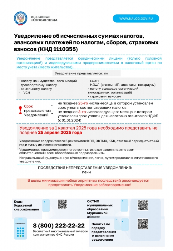 Управление Федеральной налоговой службы по Мурманской области (далее – Управление) в целях своевременного исполнения обязанности по представлению уведомлений об исчисленных суммах налогов, авансовых платежей по налогам, сборов, страховых взносов плательщика (далее - Уведомление), направляет памятки о сроках и порядке заполнения Уведомления.