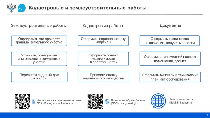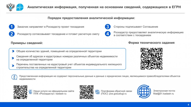 Для получения аналитической информации необходимо направить запрос на адрес электронной почты filial@51.kadastr.ru. К обращению следует приложить проект технического задания, в котором заявитель описывает требуемые параметры (территория, период, перечень показателей).